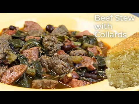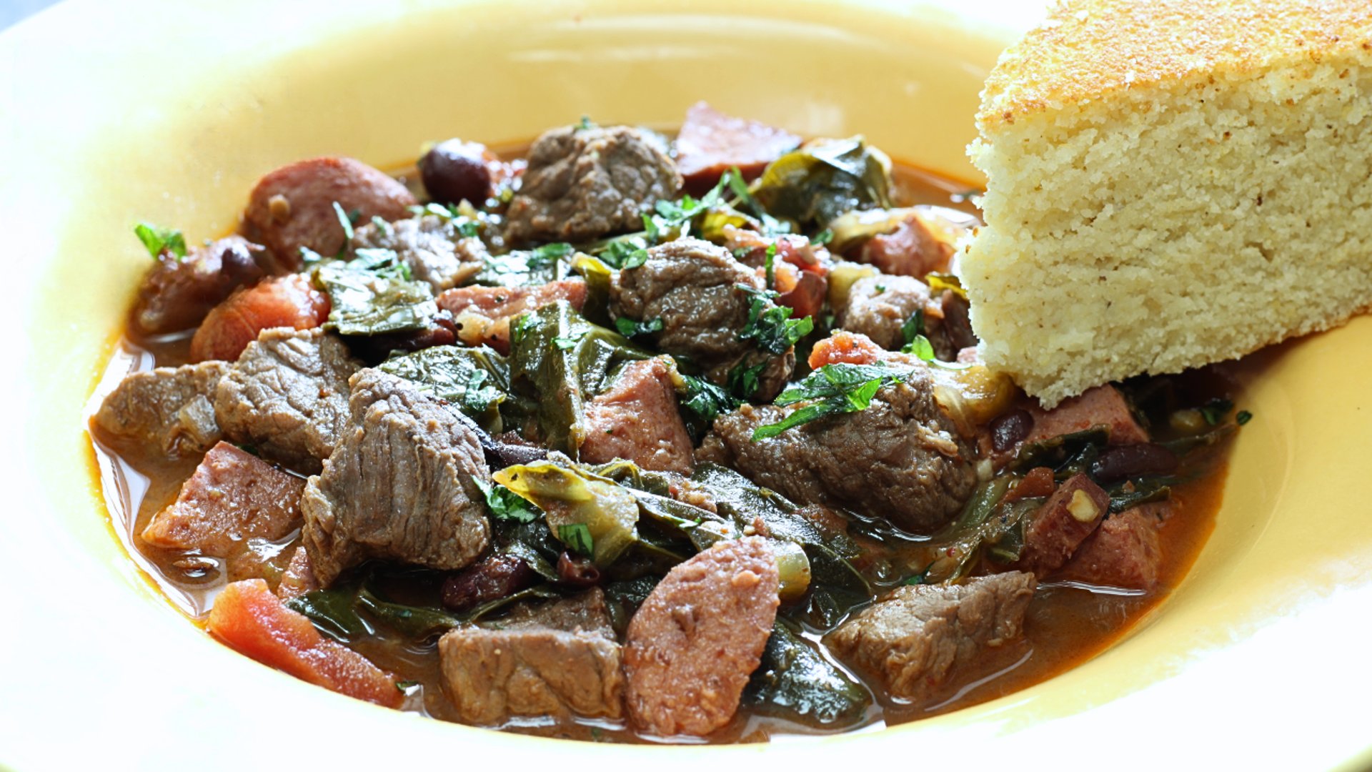 This stew combines beef tips, pork sausage, black beans, collard greens, and chili powder/paprika for a hearty and flavorful meal. Green chiles add heat, and orange juice lends subtle brightness. Served with buttermilk cornbread, it offers bold, comforting Southern flavors.