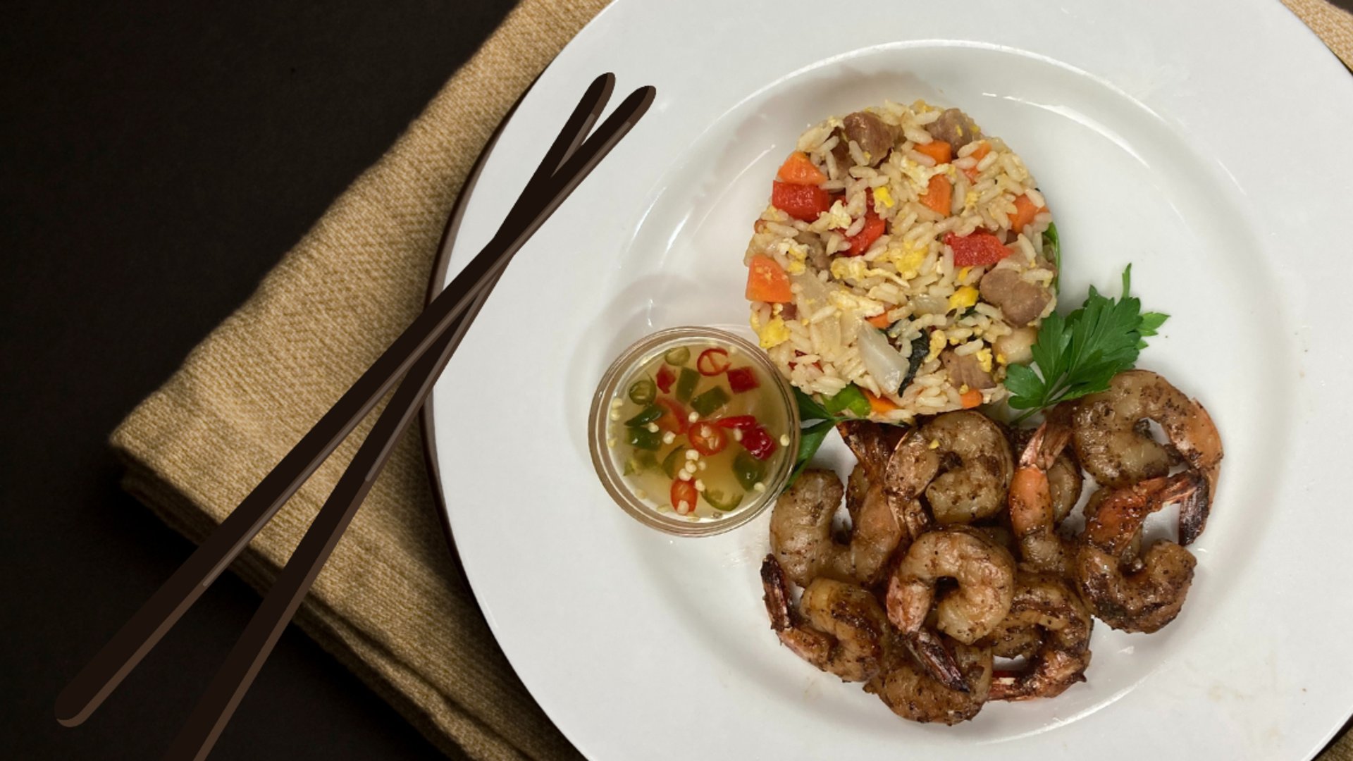 Black Peppercorn Shrimp is a dish that pairs aromatic, spicy black peppercorns with savory umami flavors. Tender and juicy shrimp are cooked to have a slightly crispy exterior. The fried rice, with red bell peppers, onions, and basil leaves, complements the shrimp perfectly.