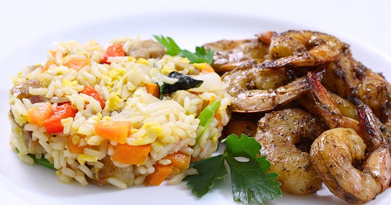 Black Peppercorn Shrimp is a delightful dish that combines the aromatic and spicy punch of black peppercorns with the rich, savory depth of umami flavors. Succulent shrimp perfectly cooked until tender and juicy, with a slightly crispy exterior. The fried rice blends bold and nuanced flavors with red bell peppers, onions and basil leaves that complements the black pepper shrimp perfectly.