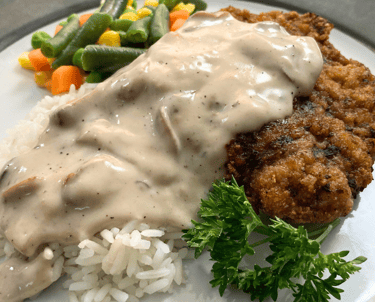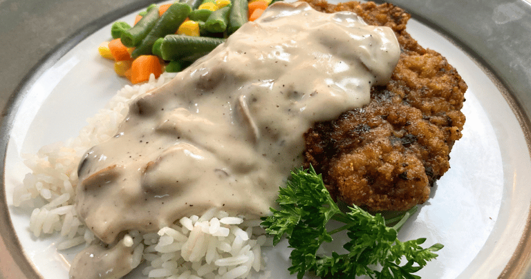 Chicken Fried Steak with Creamy Mushroom Sauce—a Southern classic elevated with rich, savory flavor. Perfectly chosen cube steak is dredged with a final coating of crushed corn flakes, fried to golden perfection, and served alongside a luscious creamy mushroom sauce that’s guaranteed to impress. Served with perfectly cooked rice and steamed mixed vegetables.