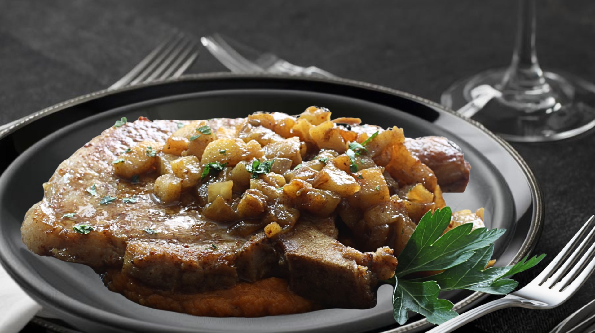Head to the kitchen and make this Pork Chops with Maple-Glazed Apples recipe — an easy, you-can-make-at-home dish brings together juicy, pan-seared pork chops, caramelized apples glazed in rich maple syrup, and a smooth, sweet potato puree infused with warm spices like cinnamon and cumin. Perfect for weeknight dinners or special occasions, this recipe delivers comfort food with a gourmet twist.