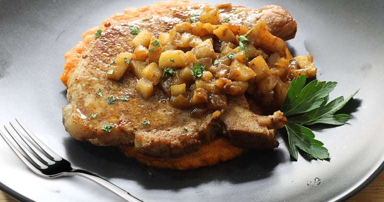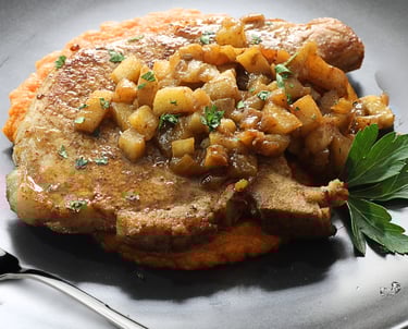 Pork Chops with Maple-Glazed Apples recipe is served with a creamy spiced sweet potato puree. This easy, you-can-make-at-home dish brings together juicy, pan-seared pork chops, caramelized apples glazed in rich maple syrup, and a smooth, sweet potato puree infused with warm spices like cinnamon and cumin.